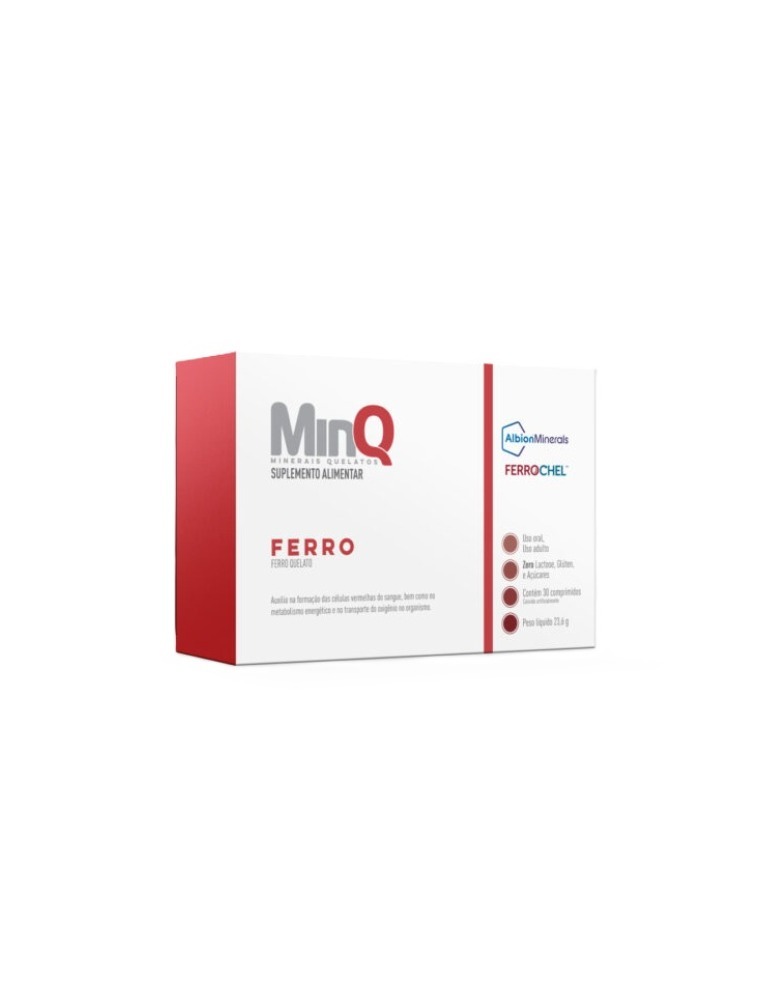 MinQ Ferro é um suplemento alimentar formulado com o mineral quelato Bisglicinato de Ferro da AlbionTM Minerals. MinQ Ferro possui 34mg de ferro por comprimido que auxilia a produção de hemácias e é indispensável para manutenção das funções biológicas. Apresentação: 30 comprimidos.